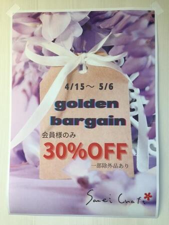 いよいよ今年も始まりました!ゴールデンバーゲン30%OFF(割引対象外除く)お待たせしました!!!! 本日(4/15)から5月6日(月)までの22日間の開催です。 -